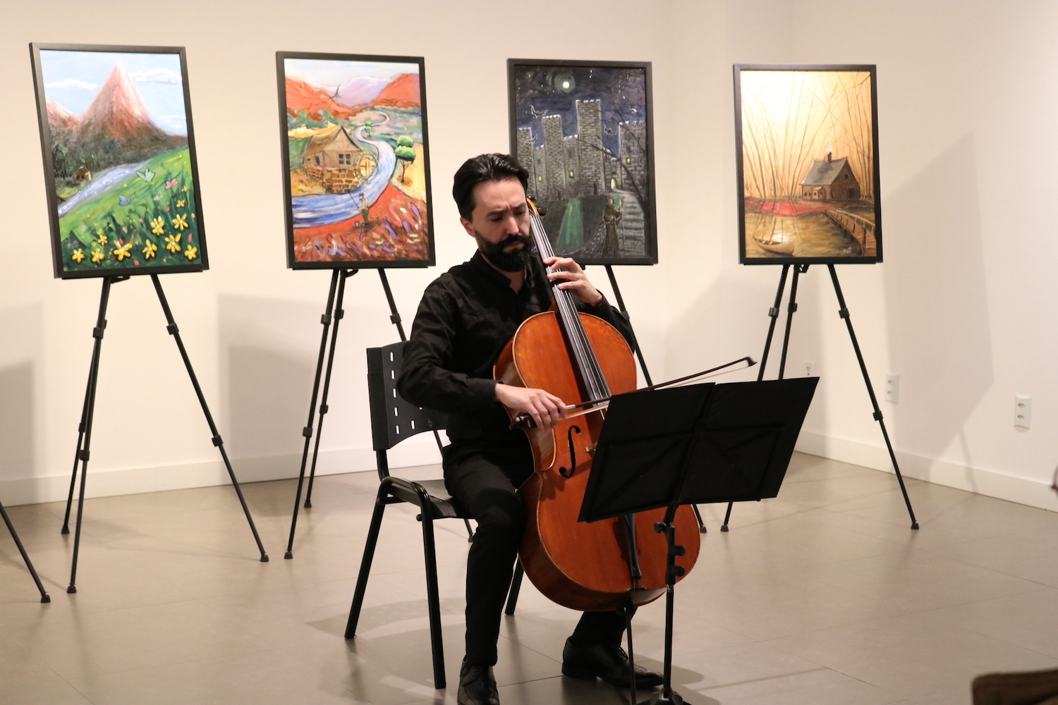 A abertura, realizada presencialmente, contou com recital do artista, apresentando suítes para violoncelo solo de Johann Sebastian Bach que serviram de inspiração para cada um dos seis quadros que compõem a mostra principal. Além dessas obras, estão expostas outras 16 telas de Buratto.