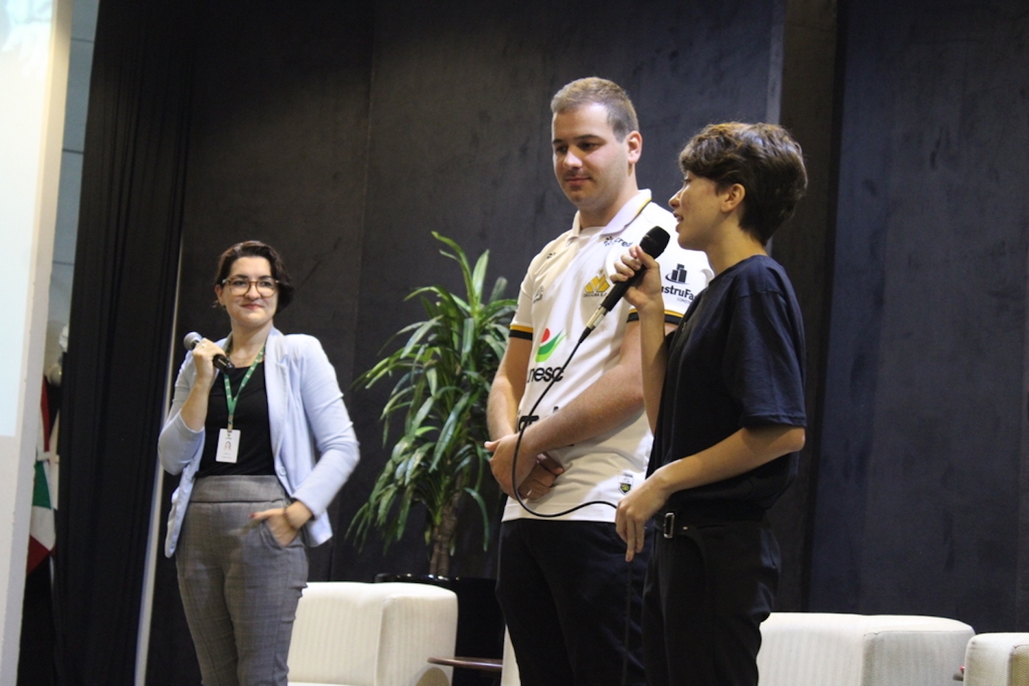 Os professores do Itinerário Formativo de Ciências Humanas e Sociais do Colégio, Amanda Cruz e Renan Borges, junto das turmas nas quais ministram as aulas, foram os responsáveis por liderar o projeto e convidar as lideranças estudantis da Universidade, Vittor Teixeira e Giovana Lisa, presidente e vice-presidente do Diretório Central dos Estudantes (DCE) da Unesc para bate-papo com os estudantes.