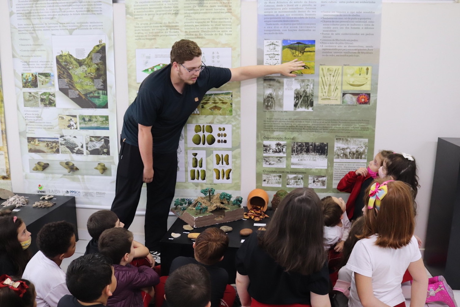 Na visita ao Lapis, os alunos foram recepcionados pelo pesquisador do Laboratório de Arqueologia Pedro Ignácio Schmitz (Lapis) da Unesc, Juliano Bitencourt Campos, e pelos bolsistas Lucas Seibert e Letícia David. Durante a ida, eles conheceram utensílios utilizados pelos povos ancestrais catarinenses, a cerâmica Guarani, os costumes, ossos, fósseis, entre outras peças arqueológicas. “A ação faz parte do projeto de extensão “Arqueologia em Sala de Aula” com os povos originários. Com a visita, fica bem mais fácil relacionar o que foi visto durante as aulas, além de consolidar melhor o conteúdo proposto e ser uma experiência que dificilmente eles vão esquecer. A exposição também aborda a ocupação humana da região para dar visibilidade à ocupação humana anterior até a chegada dos nossos parentes”, comentou Bitencourt.
