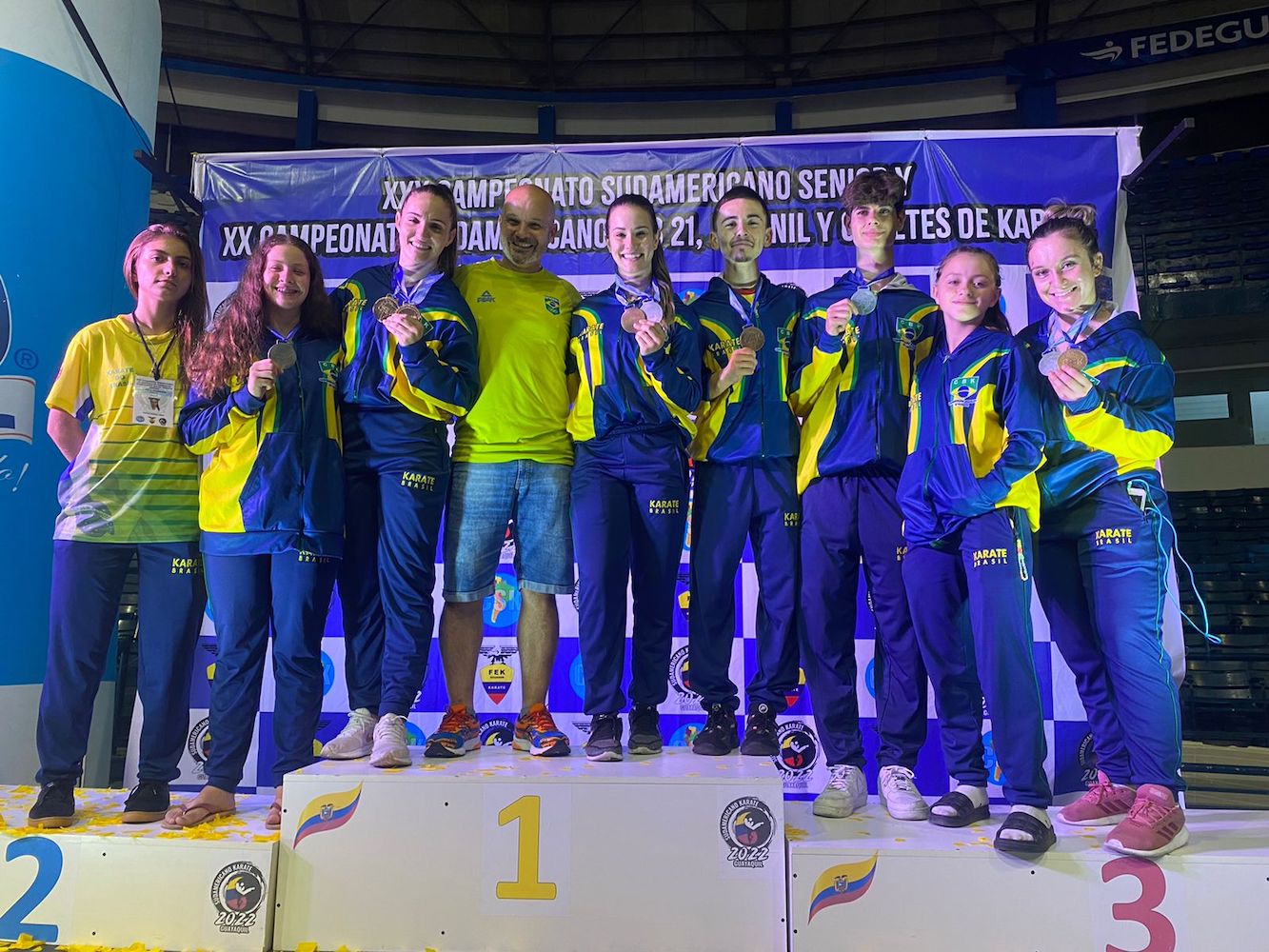 Os oito caratecas da equipe de karatê da FME de Içara/Team Everaldo/Mampituba/Unesc faturaram dez medalhas no Campeonato Sul-Americano de Karatê que terminou neste sábado, dia 23, em Guayaquil, no Equador. Foram duas de ouro, quatro de prata e quatro de bronze, conquistas que somam para que a equipe da Seleção Brasileira conquiste o troféu de campeão geral do Sul-Americano.