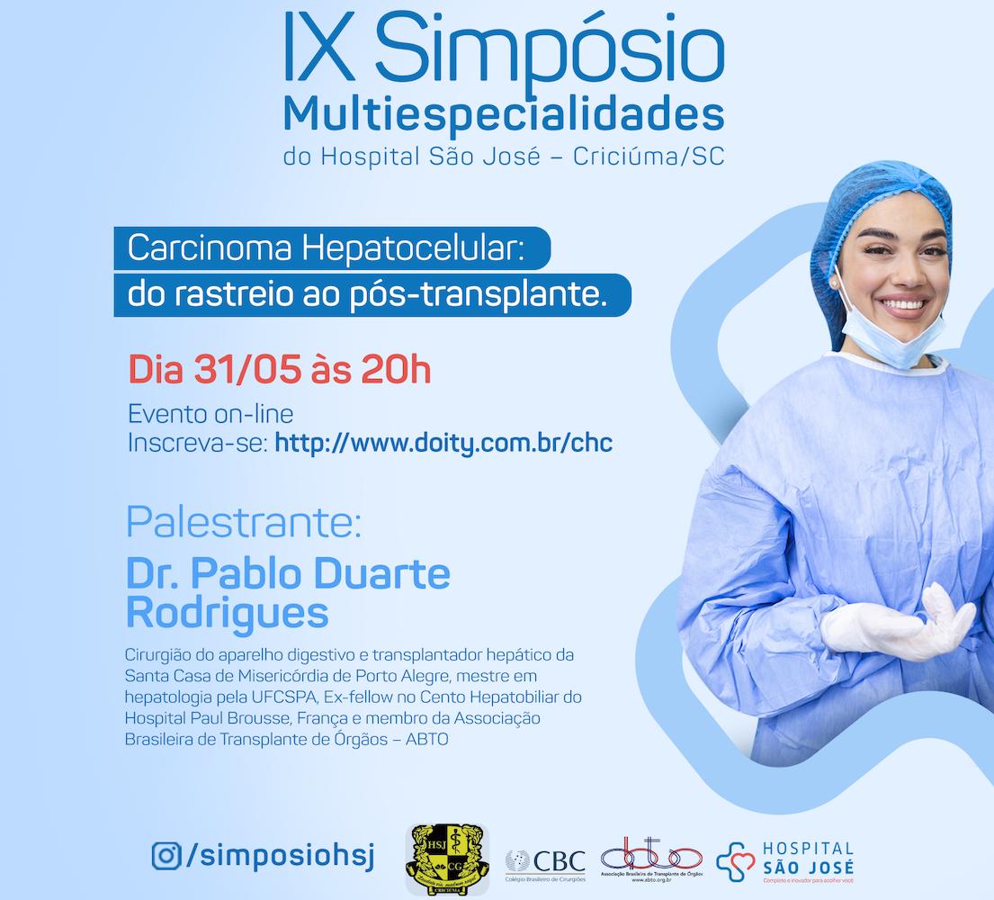 O evento será transmitido via Google Meet e tem apoio doColégio Brasileiro de Cirurgiões – CBC; Associação Brasileira de Transplante de Órgãos – ABTO. “Na Webinar deste ano, vamos discutir as particularidades do carcinoma hepatocelular, do rastreio, diagnóstico, terapias medicamentosas, cirúrgicas e radiointervencionistas, até o tratamento por transplante hepático e o seguimento pós-transplante. Nosso intuito é envolver as especialidades cirúrgicas e clínicas na discussão e debater as novas atualizações de 2022 no BCLC (consenso de Barcelona sobre manejo de carcinoma hepatocelular)”, aponta o médico cirurgião, coordenador do serviço de residência em Cirurgia Geral do HSJosé e um dos organizadores do evento Fabrício Souza Bitencourt.