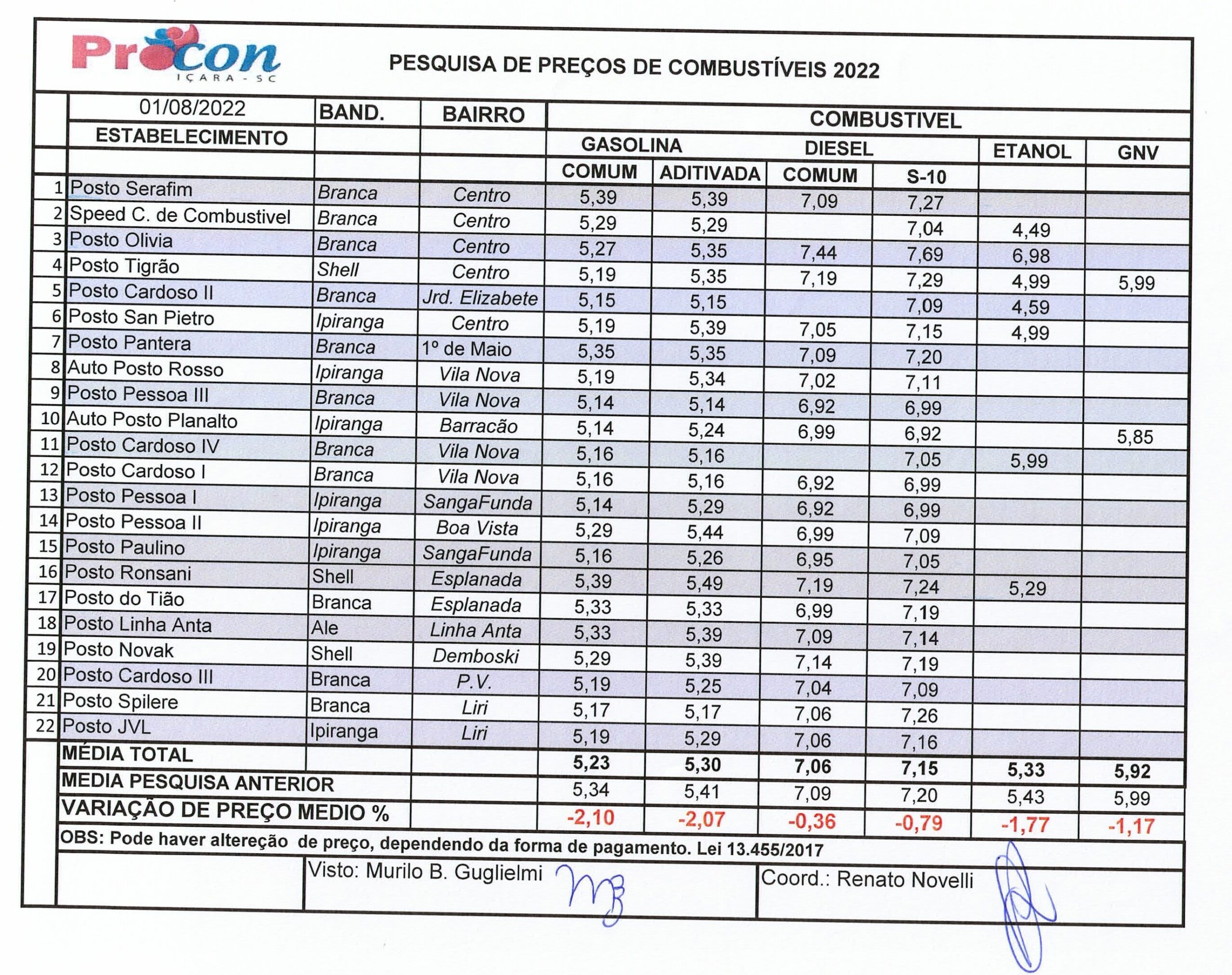 O Procon de Içara realizou nesta segunda-feira, dia 1º, mais uma pesquisa de preço dos combustíveis com intuito de acompanhar a variação do custo do produto. Nos 22 postos visitados, a gasolina comum foi encontrada no menor preço a R$ 5,14 o litro e no maior preço a R$ 5,39. A gasolina aditivada foi encontrada no menor preço por R$ 5,14 e no maior preço por R$ 5,49. O diesel comum variou entre R$ 6,92 e R$ 7,44. O diesel S10 mais em conta foi de R$ 6,99 e o mais caro R$ 7,69. O etanol variou entre R$ 4,49 e R$ 6,98. Já o GNV foi encontrado apenas em dois postos com o valor de R$ 5,85 e R$ 5,99 o metro cúbico.