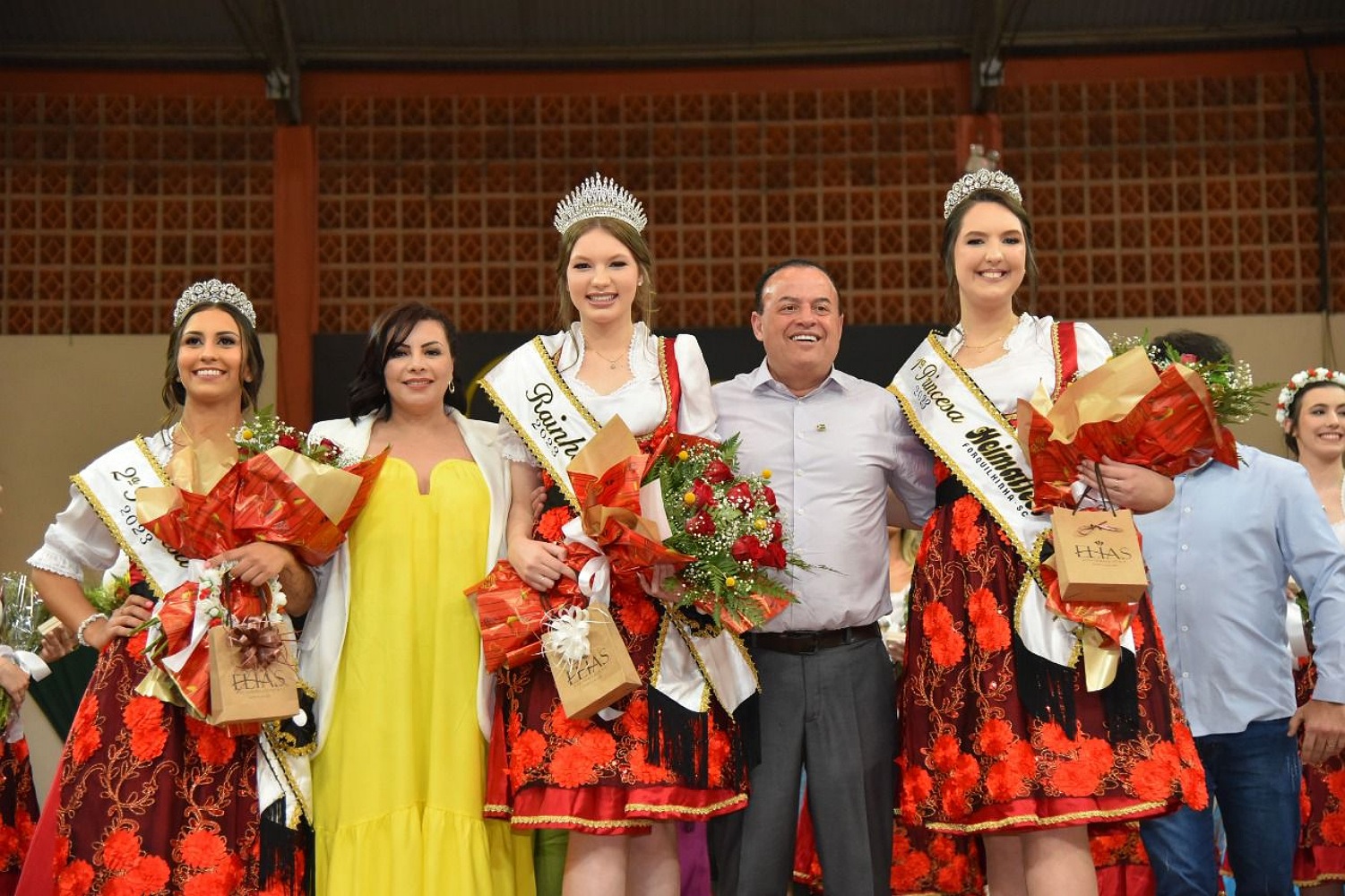 A cidade de Forquilhinha elegeu a nova a corte da 11ª edição da Heimatfest 2023, na noite do último sábado, 8, no Ginásio do Ideal Esporte Clube. São elas: Edna Savi Schmitz foi eleita Rainha, Nicoli Arantes Westrupp ficou como 1ª Princesa e Lidiana Machado Félix, como 2ª Princesa. Três belas meninas que, a partir de agora, irão representar o município. O concurso contou com três etapas virtuais, onde as candidatas falar de temas como: pontos turísticos, cultura e outras diversas da cidade. Nessas etapas contavam pontos as curtidas de vídeo das candidatas que somaram com a nota final da etapa presencial que contou desenvoltura, beleza, oratória.