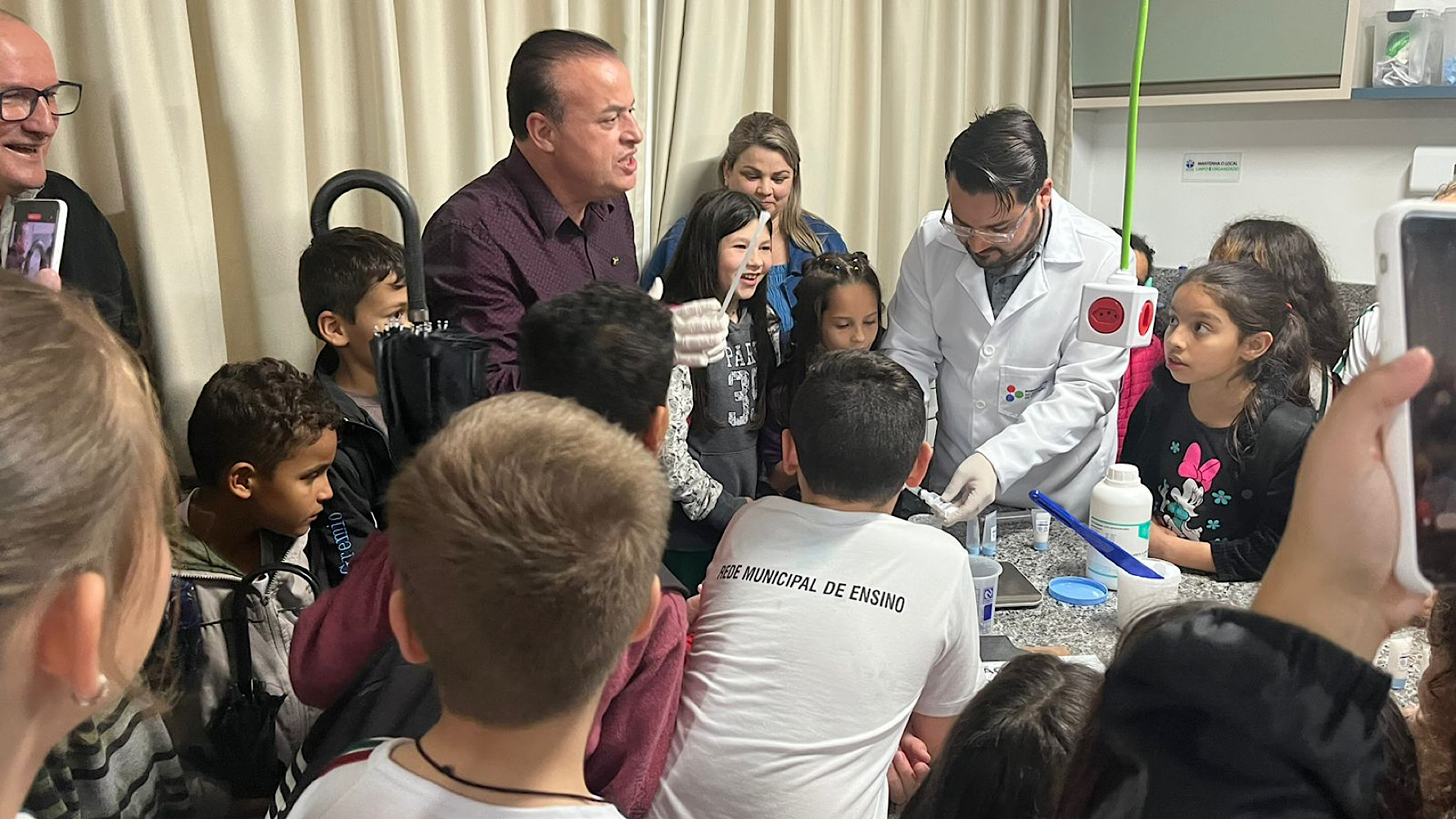 Ainda na inauguração, o prefeito aprendeu a composição de creme para as mãos com o professor Mário Fernandes Júnior. As crianças acompanharam ansiosas a atividade no laboratório.