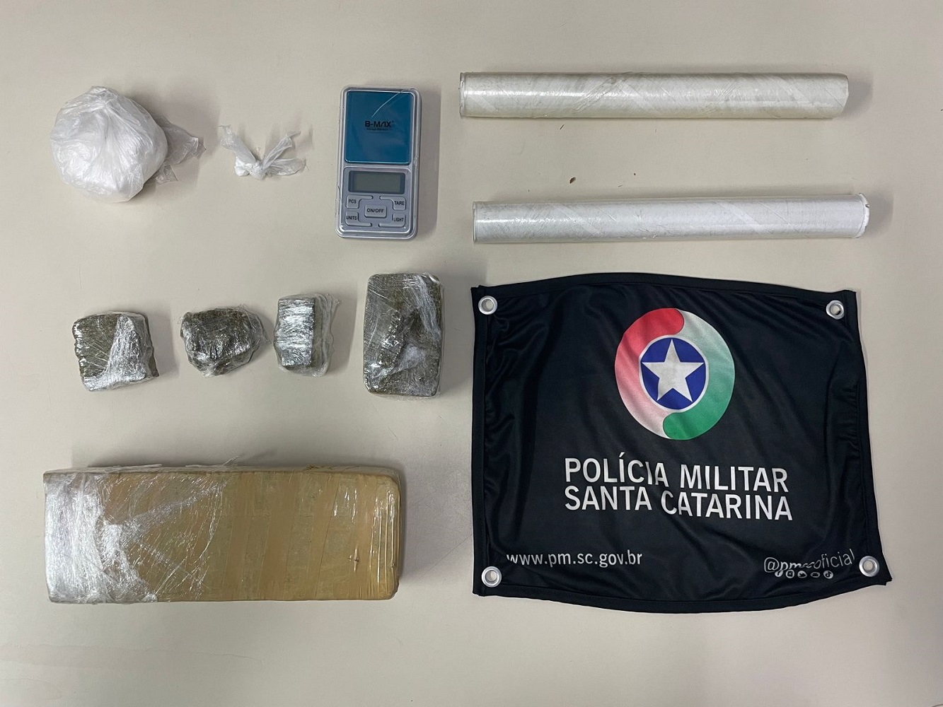 A guarnição então solicitou apoio do Canil. Já com apoio do K-9 de Araranguá, foram encontrados 867 gramas de maconha e 97 gramas de cocaína, além de uma balança de precisão e plástico filme.