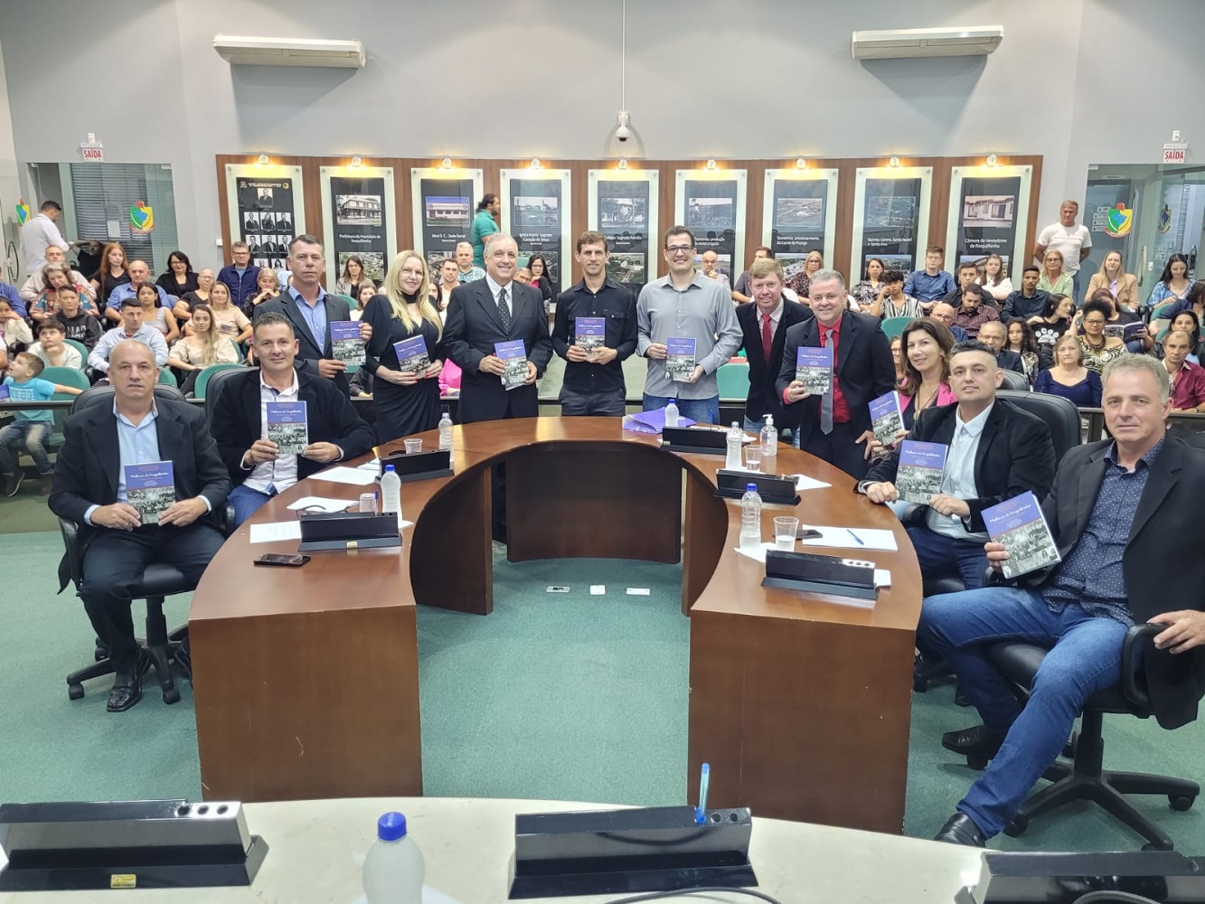 O lançamento do livro “Mulheres de Forquilhinha – Volume 2: O espaço da produção e o espaço da cidadania” foi prestigiado pelo público nesta segunda-feira, dia 19, na Câmara de Vereadores. Os autores Marcelo Pastafiglia, André Cavaller da Luz e Gustavo Dal Toé falaram sobre a obra que ressalta a participação das mulheres no desenvolvimento do município.