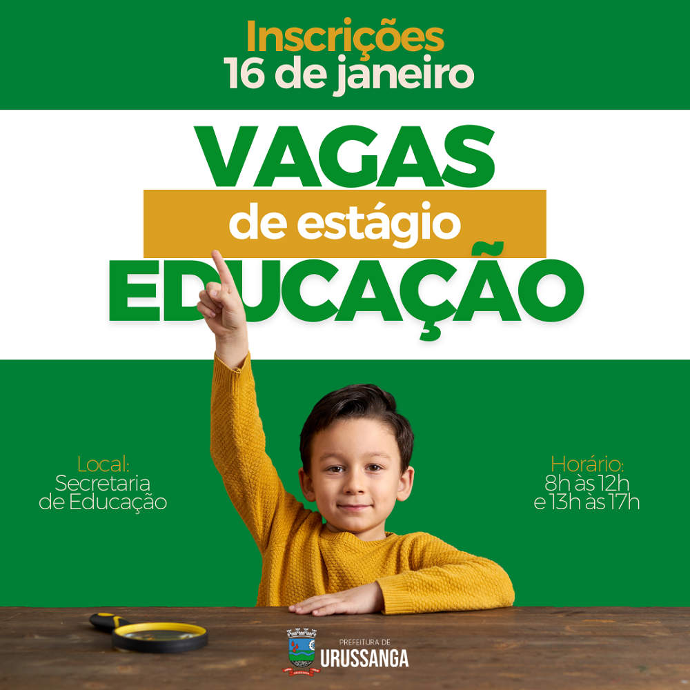 O Governo Municipal de Urussanga, por meio da Secretaria Municipal de Educação, informa que está com vagas de estágio em aberto para a área da educação. As vagas são na educação infantil para a função de auxiliar de sala de aula nas turmas de creche. As inscrições deverão ser realizadas no dia 16 de janeiro, das 8h às 12h e das 13h às 17h, na Secretaria Municipal de Educação, localizada na Rua João Maria Cancellier, 85, Bairro da Estação, em Urussanga.