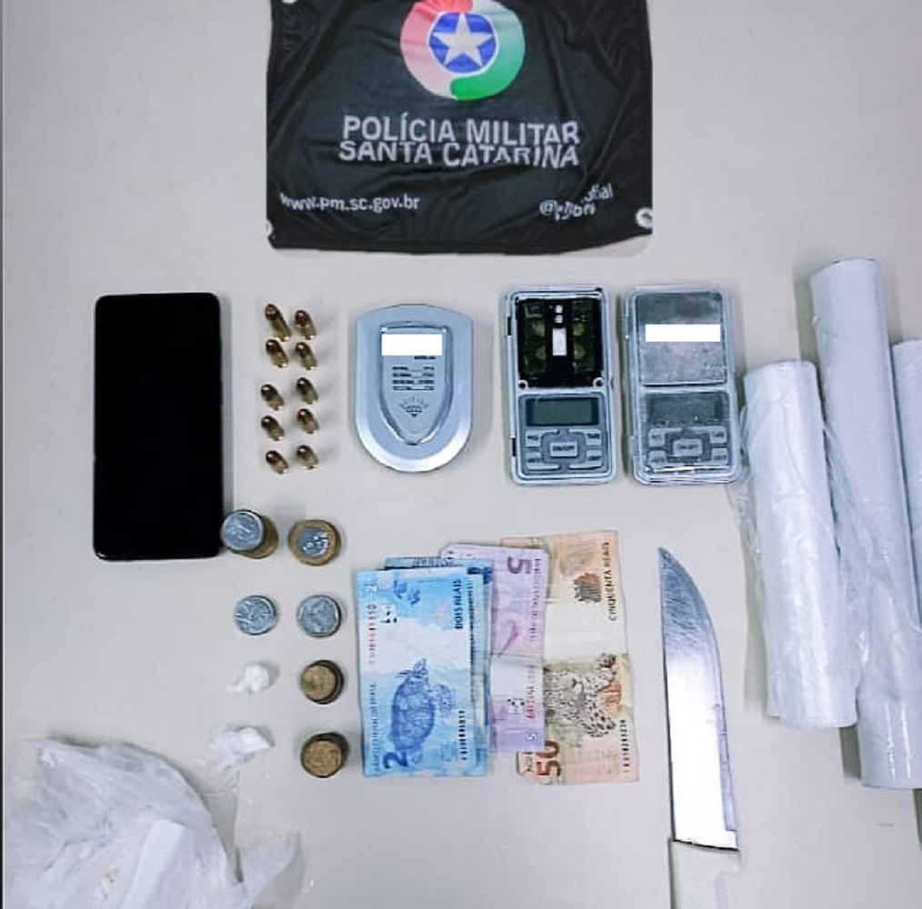 O homem não portava nenhum material ilícito, porém, durante a busca em sua residência, os militares encontraram 83,2 gramas de cocaína, nove munições de calibre nove milímetros, uma munição de calibre 38, três balanças, um celular e um rolo de plástico filme.