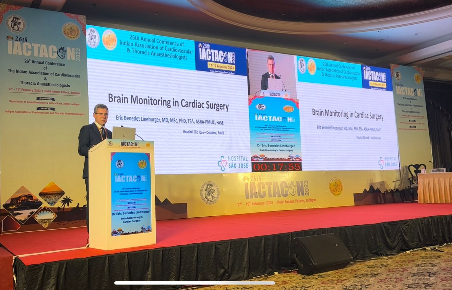 “O primeiro foi o Congresso Nacional da Associação de Anestesiologistas Cardiotorácicos da Índia, que ocorreu em Jodhpur. Neste congresso, falei sobre monitorização cerebral em cirurgia cardíaca e depois participei de um painel sobre o futuro da pesquisa e anestesia cardiovascular. Neste momento, participaram também um profissional que faz parte do Departamento de Anestesiologia de Leipzig, na Alemanha, e o responsável pelo departamento de pesquisa da Cidade do Cabo, na África do Sul. Além deles tivemos também um especialista de Nova Deli, na Índia”, explica o médico anestesiologista do HSJsé, Dr. Eric Benedet Lineburger.