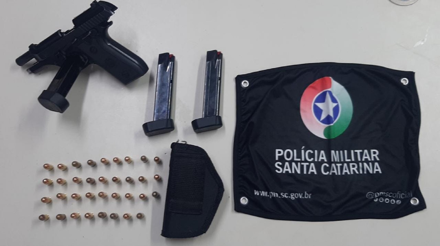 Já com apoio de um cão de faro, foi encontrada uma pistola de calibre 380, com numeração suprimida, no motor do veículo. Assim, um homem de 20 anos relatou que faria a entrega da arma e que ganharia dinheiro com isso. Ele ainda informou aos militares que colocou a pistola no veículo sem ninguém saber.