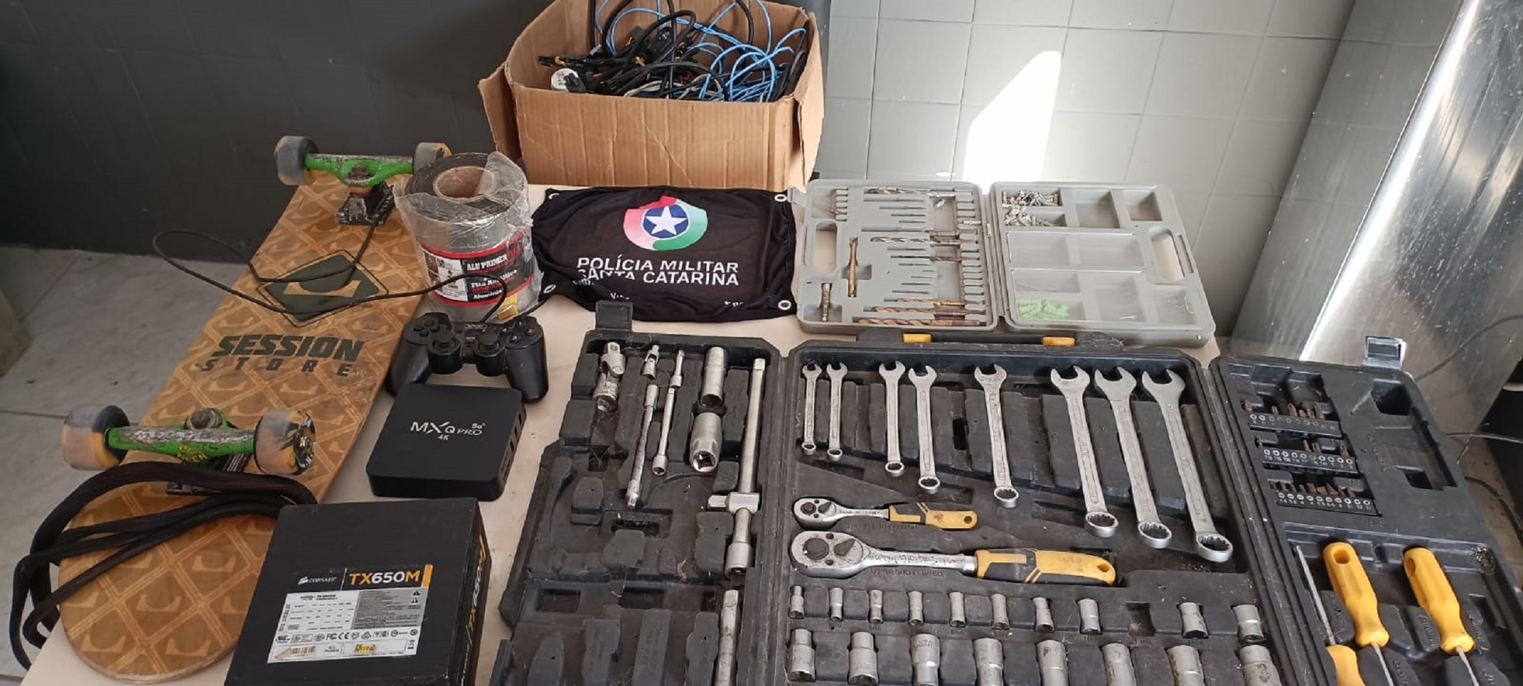 Conforme as informações do 9º Batalhão da Polícia Militar, uma guarnição estava em rondas quando avistou a mulher em atitudes suspeitas. Ela já é conhecida por ser pessoa em situação de rua e usuária de entorpecentes e estava em posse de dois aparelhos TV Box, um skate, duas maletas de ferramentas, um rolo de fita asfáltica, um controle de vídeo game, além de fios elétricos.