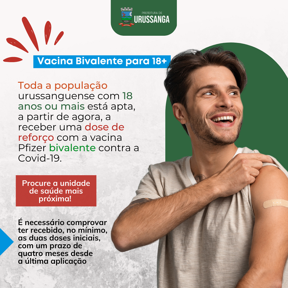 O Governo de Urussanga, através da Secretaria Municipal de Saúde, informa que, a partir de agora, toda a população a partir de 18 anos, está apta a receber uma dose de reforço com a vacina Pfizer bivalente contra a Covid-19. Vale lembrar que para garantir a aplicação deste reforço, é necessário que a pessoa já tenha tomado ao menos duas doses da vacina monovalente (Pfizer, Coronavac, AstraZeneca, Janssen) contra a Covid-19, sendo que a última deve ter sido aplicada, no mínimo há quatro meses.
