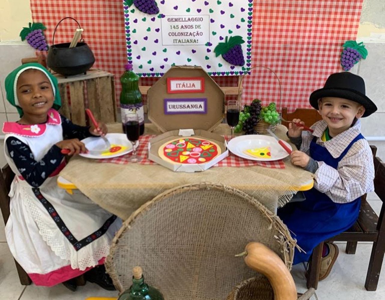 Atividades diversas, que divertem, encantam e ensinam. Assim tem sido a aplicação do projeto “Conhecer para Pertencer – 145 anos da Imigração Italiana em Urussanga”, realizado nas escolas urussanguenses durante este mês de maio. Com pinturas, danças, cenários e roupas típicas, os estudantes de toda a rede de ensino, têm conhecido mais sobre a colonização italiana, seus costumes, culinária, história, brincadeiras.