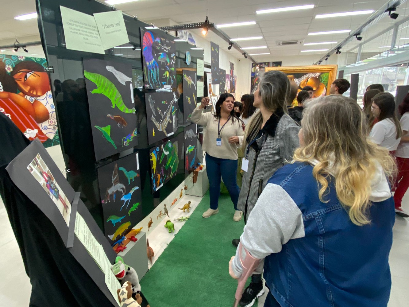 Aluno do 8º ano da Escola São Rafael, Vinícius é portador de deficiência intelectual leve e transtorno de déficit de atenção com hiperatividade (TDAH). O momento foi prestigiado pelos colegas de classe, professores, e servidores do Governo Municipal. “Gosto bastante de desenhar planetas e dinossauros”, conta o adolescente de 13 anos, que criou a exposição ‘Planeta Zero’ com cerca de 150 personagens diferentes.