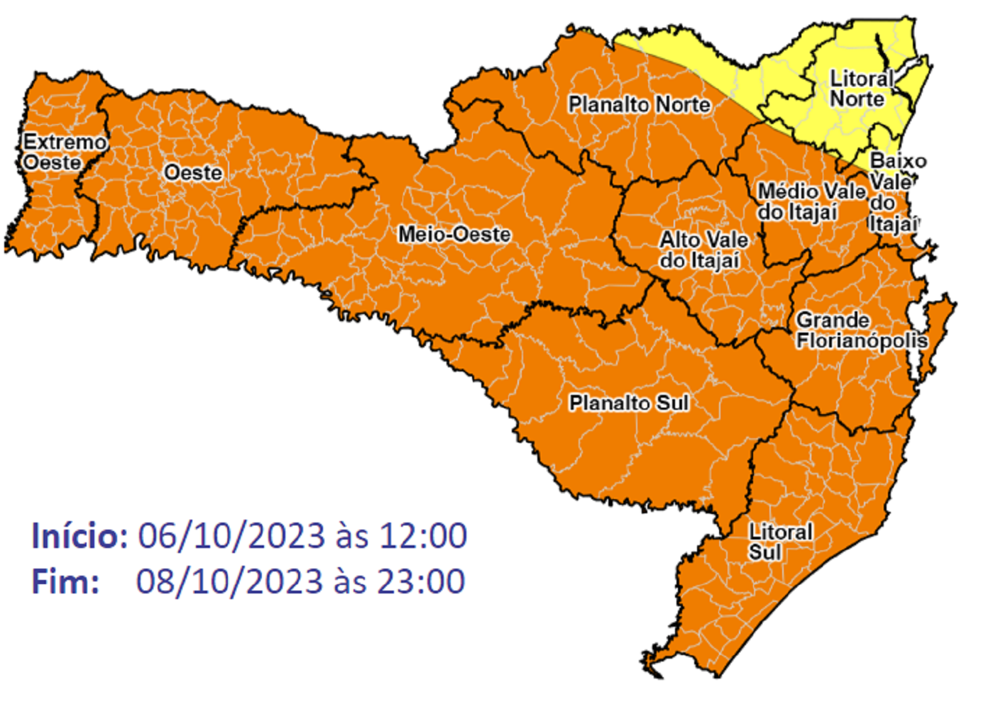 Santa Catarina está sob alerta devido à chegada de um período de instabilidade entre sexta-feira (6) e domingo (8). Espera-se chuva persistente ao longo do fim de semana, com acumulados que podem ultrapassar 100 milímetros. Isso aumenta significativamente o risco de alagamentos e deslizamentos de terra em várias áreas do estado. Devido aos volumes consideráveis de chuva previstos, juntamente com o solo já saturado e níveis de rios elevados, também há um risco de enxurradas e inundações graduais. As previsões são da Secretaria de Estado da Proteção e Defesa Civil de Santa Catarina e a Epagri/Ciram.