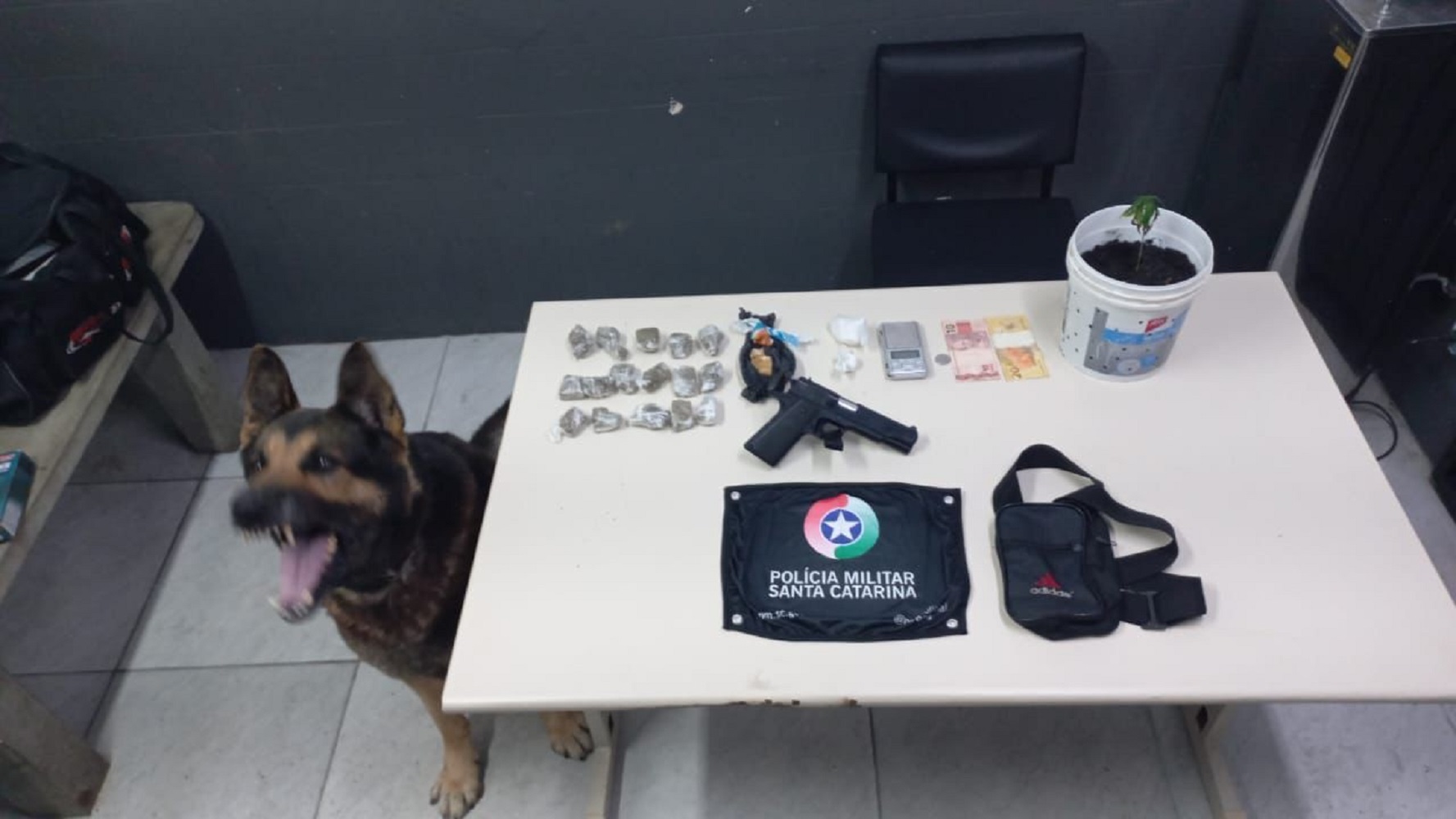 A Polícia Militar apreendeu drogas, um simulacro de arma de fogo, dinheiro e uma balança de precisão. O caso ocorreu nessa sexta-feira (6), no bairro Renascer, em Criciúma.