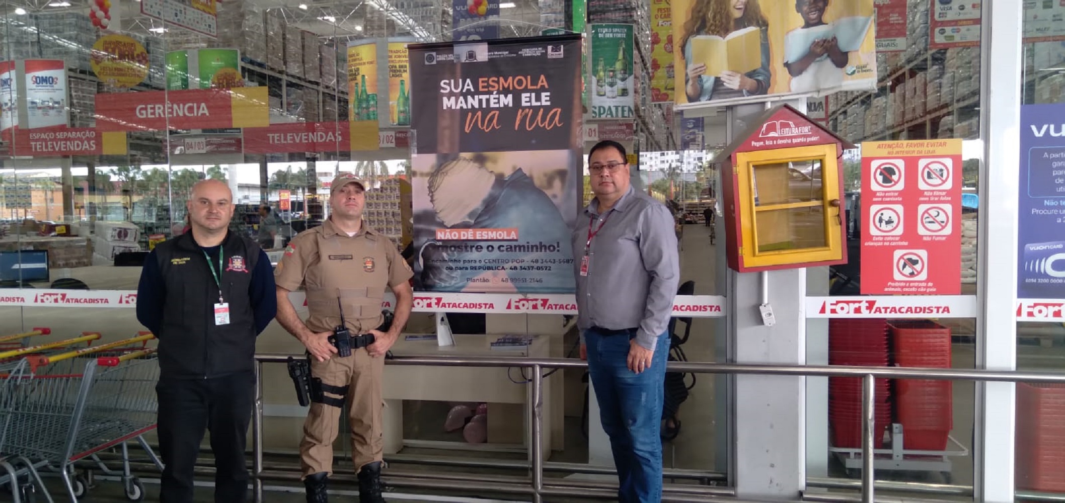 A ação realizada nessa sexta-feira (20), contou com a presença de gerentes da rede de supermercados, Polícia Militar e Assistência Social. No local, além de panfletagem, foram instalados banners da campanha, que servirão não só de alerta, mas auxiliarão no comportamento de funcionários e clientes, no momento de dar ou não esmolas.