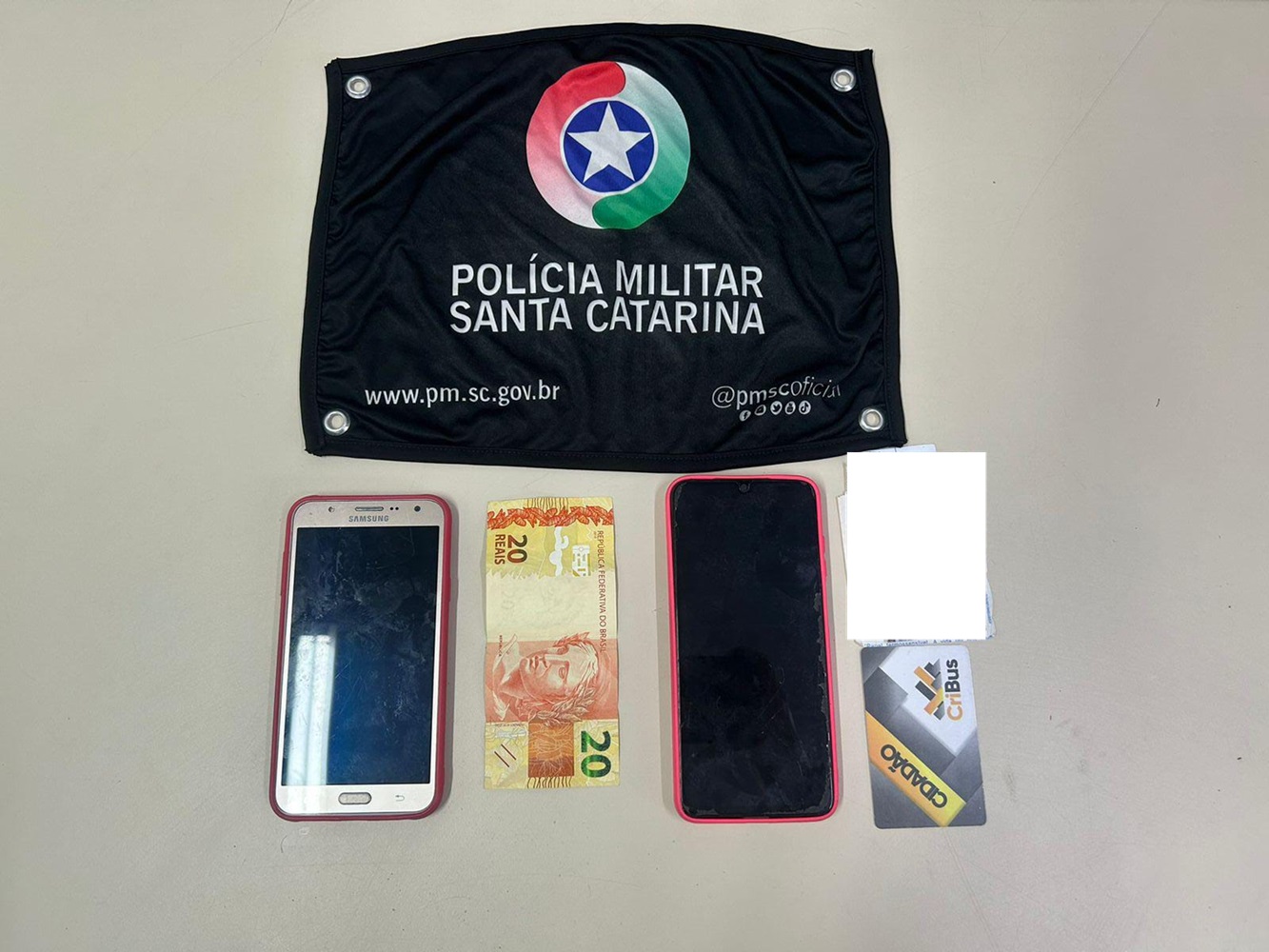 Durante a abordagem, o suspeito tentou esconder os objetos do roubo, que incluíam dois celulares com capas rosas, dentro de sua roupa íntima.