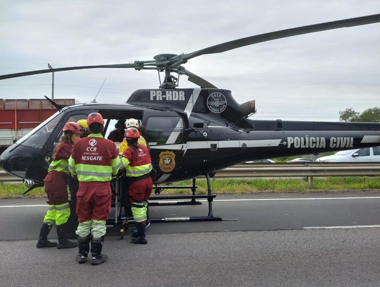 A aeronave da Polícia Civil, tripulada pelos policiais do Saer e profissionais de saúde do Sarasul, foi acionada para prestar apoio à ocorrência. A vítima já recebia atendimento da Unidade de Suporte Avançado da CCR Via Costeira e era desencarcerada pelo Corpo de Bombeiros Militar. O homem apresentava múltiplas fraturas nas pernas, com sangramento ativo e sinais de choque hipovolêmico.