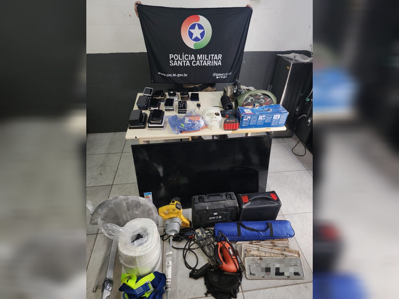 De acordo com as informações do 9º Batalhão da PM, na casa dos suspeitos, foram encontrados um Fiat Uno e uma carretinha com registro de furto. Além disso, foram apreendidos um televisor de 50 polegadas, 61 celulares, oito tablets, a maioria furtados de uma loja de Cocal do Sul, ferramentas e 10 placas de veículos.
