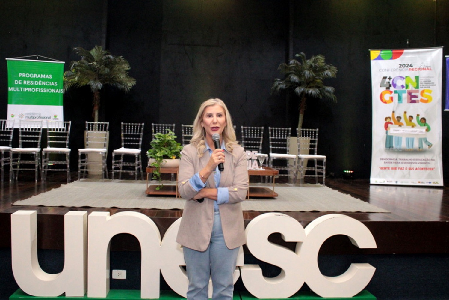 A reitora da Unesc, Luciane Bisognin Ceretta, fiel defensora do Sistema Único de Saúde (SUS), foi a palestrante convidada para abrir oficialmente a etapa macrorregião Sul da 4ª Conferência Estadual de Gestão do Trabalho e da Educação na Saúde (CNGTES), realizada no campus da Universidade. O evento é organizado pelo Conselho Estadual de Saúde de Santa Catarina (CES), com o apoio do Programa de Pós-graduação em Saúde Coletiva (PPGSCOL), e voltado para os profissionais e comunidades residentes nas Associações de Municípios das Regiões Carbonífera, Extremo Sul Catarinense e de Laguna, respectivamente.