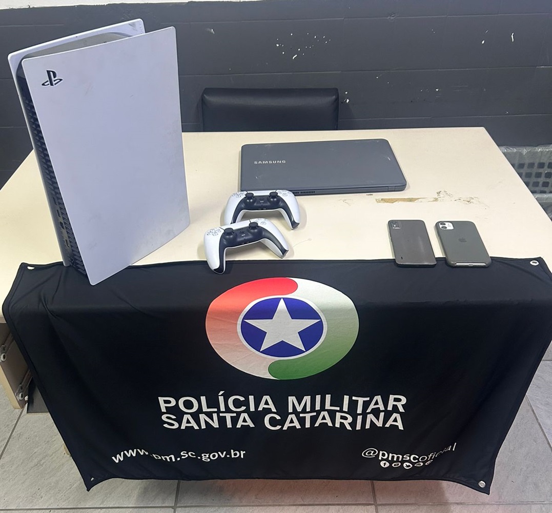 Durante a busca no carro, os policiais encontraram um console e dois controles de PlayStation 5. A vítima do roubo reconheceu o console como seu, apresentando a nota fiscal e confirmando a propriedade na Central de Flagrantes. Também foi encontrado um notebook Samsung, cuja procedência os suspeitos não souberam explicar.