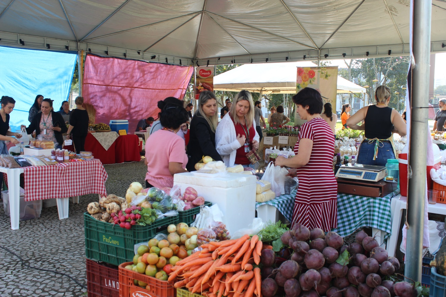Produtos coloniais, artesanato, frutas e verduras orgânicas são alguns dos produtos comercializados em sete bancas.