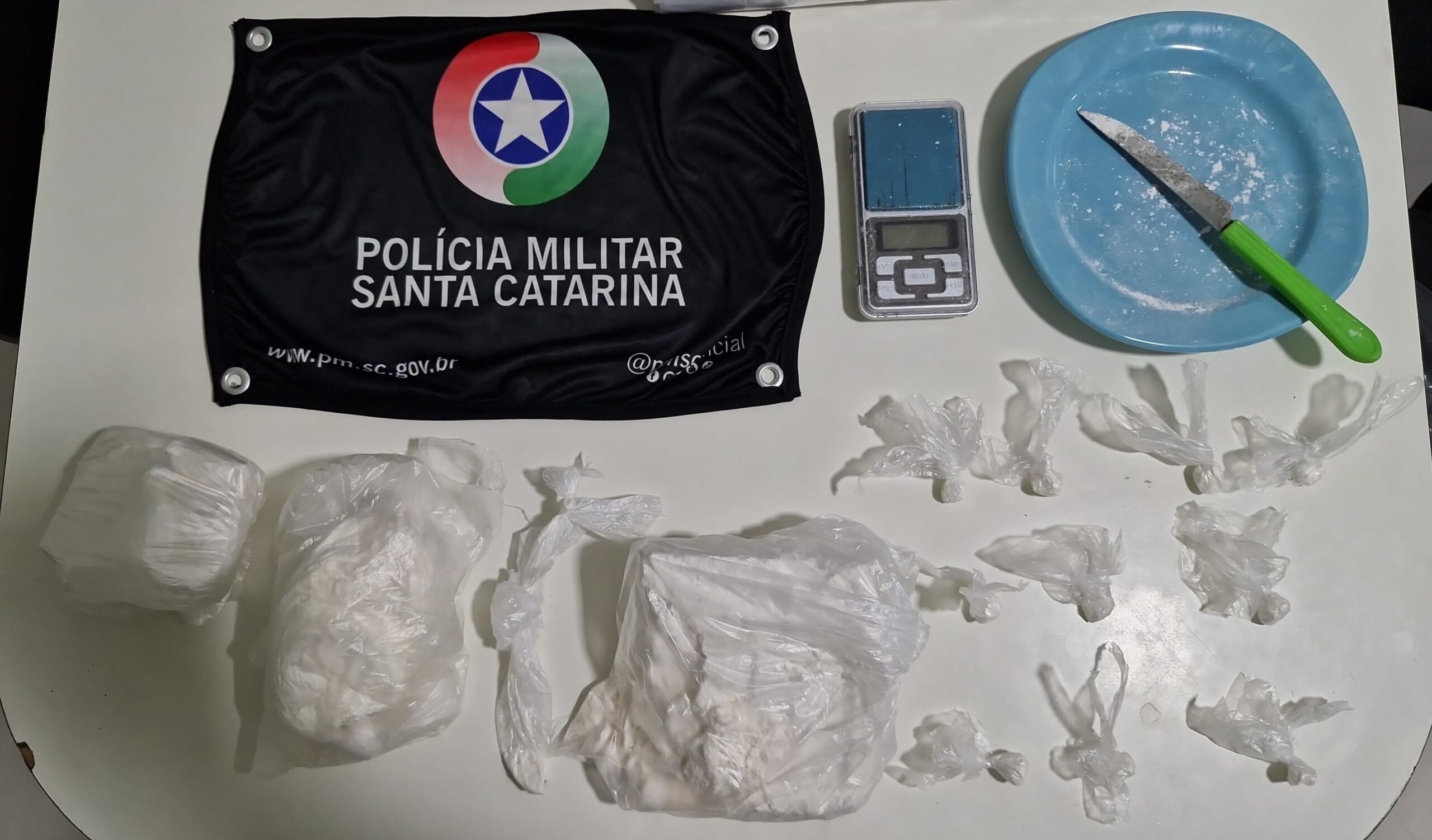 Durante a abordagem, o suspeito jogou invólucros brancos ao chão, que foram identificados como contendo 12 gramas de cocaína. Em seguida, os policiais foram até a residência do homem, onde encontraram mais 852 gramas de cocaína, além de uma balança de precisão e embalagens plásticas, totalizando 864 gramas de entorpecentes.