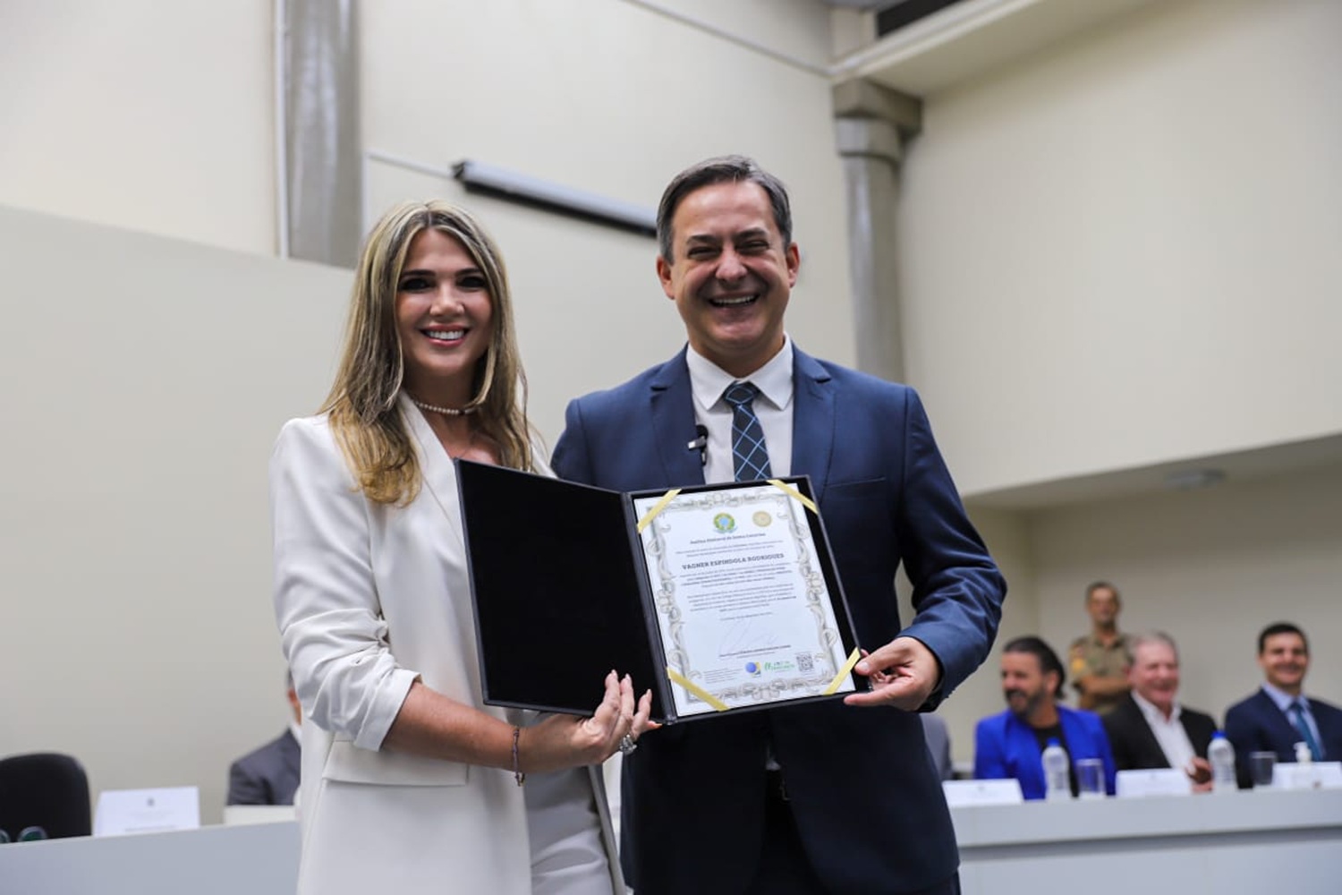 O prefeito eleito de Criciúma, Vaguinho Espíndola (PSD), foi diplomado em uma cerimônia na tarde desta quarta-feira, dia 18, no Fórum da Comarca de Criciúma. Além dele, o vice-prefeito eleito, Salésio Lima (PSD), também recebeu o diploma. Este evento é o último ato oficial das eleições antes da posse, no dia 1º de janeiro de 2025. A cerimônia contou com a presença de autoridades, familiares e apoiadores dos eleitos.