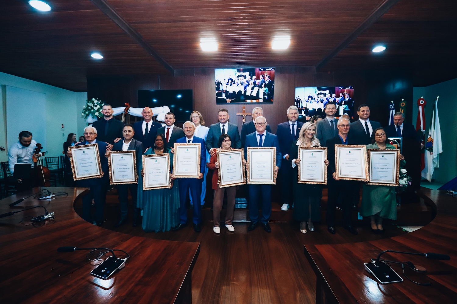 A cerimônia, que lotou o plenário da Câmara, foi conduzida pelo presidente Elton Nuernberg, que em seu discurso, destacou o papel fundamental dos homenageados para a cidade. “Hoje, com todo respeito que tenho às nossas autoridades municipais, as estrelas da noite são essas nove personalidades aqui presentes. Cada um carrega uma trajetória que se entrelaça com os valores, a cultura e o desenvolvimento do nosso município”, afirmou.