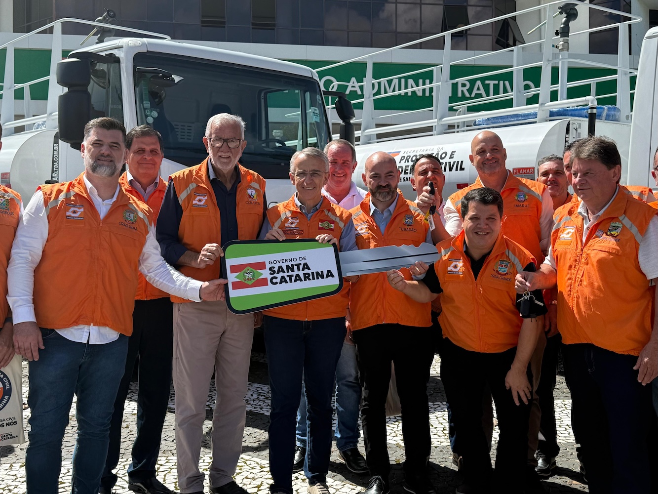 Além do caminhão-pipa, Cocal do Sul também recebeu um kit completo da Defesa Civil, com veículo, drone, TV, notebook e tablet.