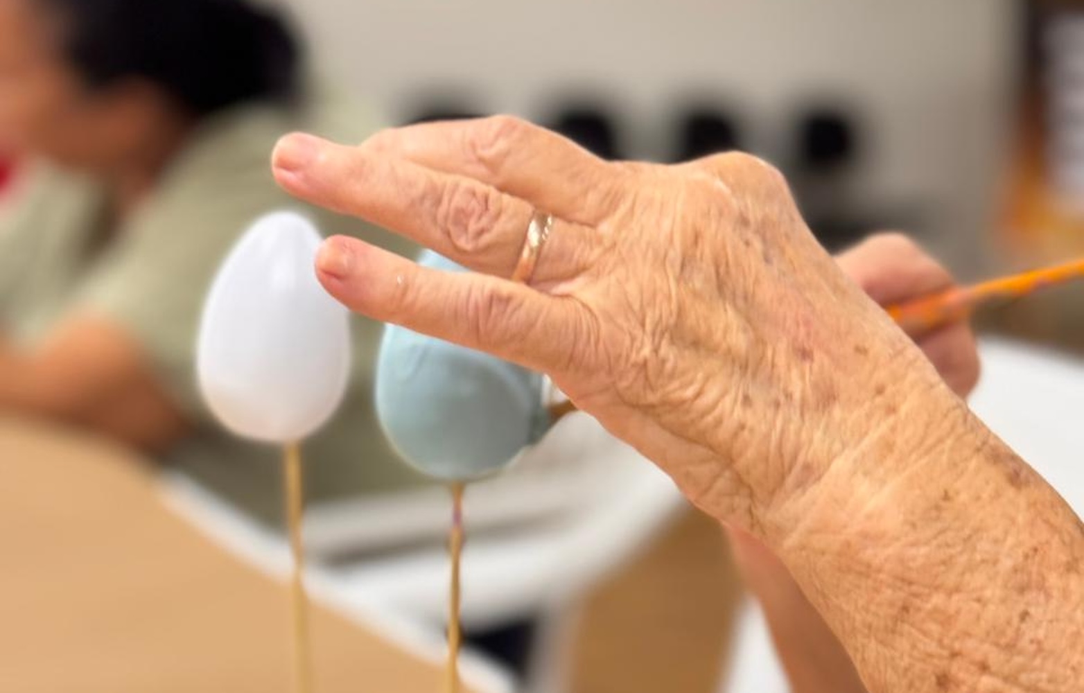 Sobre a dinâmica dos encontros, Diana descreveu um ambiente de dedicação. “Preparamos mesas com forro e tintas. Cada idoso pintou três ovinhos com muito carinho. Percebemos que eles se sentiram valorizados por contribuir com a decoração da praça”, concluiu.