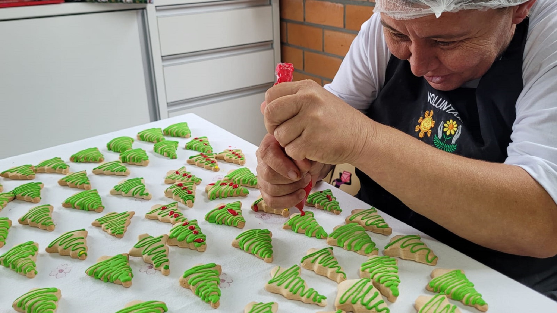 Potes com bolachas decoradas, mini árvores e guirlandas estão entre os itens comercializados.